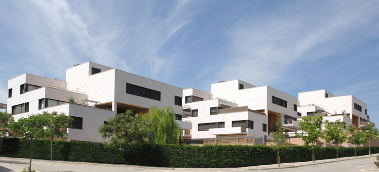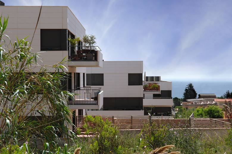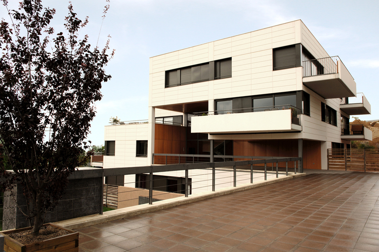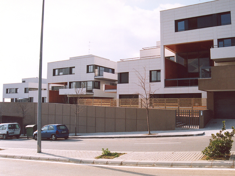 El projecte, que desenvolupa un conjunt de 33 habitatges, està situat en un solar amb un fort pendent, ben orientat i amb vistes llunyanes del mar. A partir d’una normativa urbanística que determinava volumetries en bloc plurifamiliar aïllat, es va proposar una modificació del planejament per fer possibles edificis de matriu cúbica ajustats amb cura a la topografia del terreny. Així doncs, els tres edificis iguals s’esglaonen entre ells amb un decalatge d’un pis sobre les plataformes que formen els aparcaments semisoterrats.