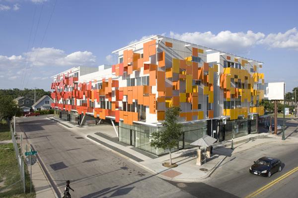 Austin, Texas-based Bercy Chen Studio enlivened the exteriors of this mixed-use development (retail, offices, residential condos) with colored panels inspired by Brazilian artist Helio Oticica. Like a sunburst across the corner façades, the design creates a strong presence in...