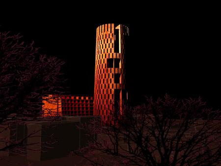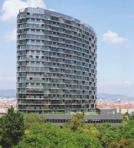 Die Widmung gab dem Hochhaus seine Form vor: eine Ellipse mit 70 Metern Längsdurchmesser auf einem 65 Meter tiefen, fast quadratischen Sockel. Die Architekten Neumann + Partner und das Büro ARTEC lösten die Rundung in polygonale Segmente auf und entwickelten eine komplexe Fassade...