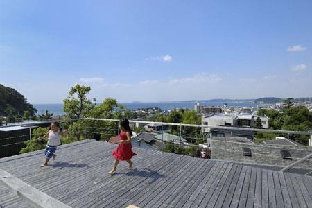 この家には、デッキが4か所ある。見晴らしのいい屋上デッキでは食事をしたり、お風呂上がりに涼んだり、夫がビールを持って上がってきたり。3階海側の デッ キはDKと一体化した空間。庭の樹木が枝を伸ばし、自然も身近だ。