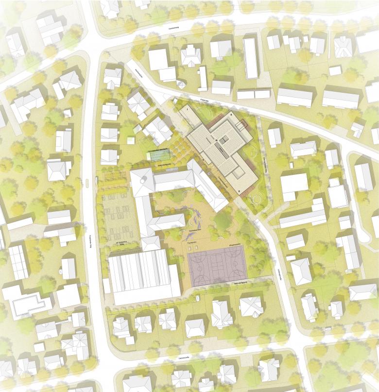 Auszug Jurybeurteilung: „Städtebauliches Konzept_ Integration in die Umgebung: Der dreigeschossige Ersatzneubau fügt sich harmonisch in die vorhandene städtebauliche Struktur ein. Der Erweiterungsbau nimmt Rücksicht auf die bestehende Bebauungsdichte, Höhenentwicklung und die Gliederung der Baukörper ohne die Umgebung zu dominieren. Wegeführung und Erreichbarkeit: Die Erreichbarkeit des Gebäudes, insbesondere für Schüler, Lehrer und Besucher ist optimiert aufgrund der Berücksichtigung und Bildung eines Campus Boulevard und der vielen Terrassen im Außenbereich.