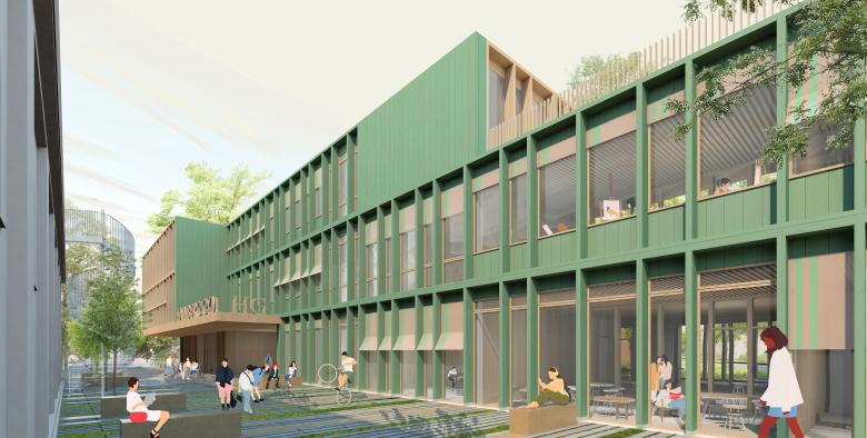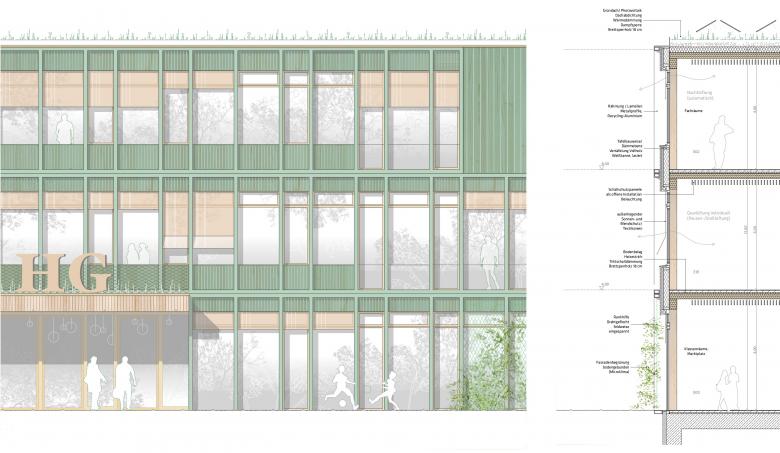 Freiraum_ Die Gliederung des Freiraums ist klar erkennbar und sinnvoll gestaltet. Die Erschließung über den neuen Campus-Boulevard als verbindendes Element wirkt stimmig. Positiv wird die Verknüpfung der grünen Klassenzimmer mit den Lernräumen bewertet. Die Anordnung der Fahrradabstellanlagen als Verbindung zwischen Alt- und Neubau ist sinnvoll gestaltet, über die Dimensionierung der Zuwegung sollte noch einmal kritisch nachgedacht werden. Die Perspektive deutet auf einen Wechsel zwischen befestigten und durchgrünten Flächen hin, was der Barrierefreiheit entgegenstehen könnte. Die gleichzeitige Nutzung des Sportplatzes als Retentionsraum wird kritisch hinterfragt. Weiterhin wären weitere Aussagen zum Regenwassermanagement wünschenswert.