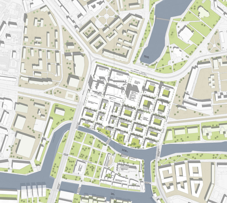 URBAN DESIGN – The main competition area (Central Square and „Altstadt“) is divided into 25 rectangular areas between 110 x 80 m and 55 x 60 m. These proportions corresponds very well with the excellent functioning structures of international major cities. The depth of the districts decreases from north to south according to the decrease in density of use towards the river. Two of these districts are not and other ones only partially built upon. In this way, together with the road hierarchy, a graded open space system of public streets and squares arises. The fringe of the „Kaiserplatz“ would also be restored as well as the historic market of „Altstadt“. The area northern of the former house of the Soviets represents the remains of the "central place" connects to the free space around the castle pond in addition to ist function as a public square. The areas provided for development should have different character - they can be realized seperately from each other in time and space and independent by different investors, developers or public clients. However, this scheme enables in different ways the integration of historical elements, parts of buildings, room corners or facade replicas, in order to account for the "genetic code" of the city. Even incomplete realizations offers independent and fully functional solutions which improve the urban and spatial situation in any case. This also applies to the technical infrastructure: the road network and the structural and spatial pattern of streets and squares also consistently follows the technical supply and disposal.