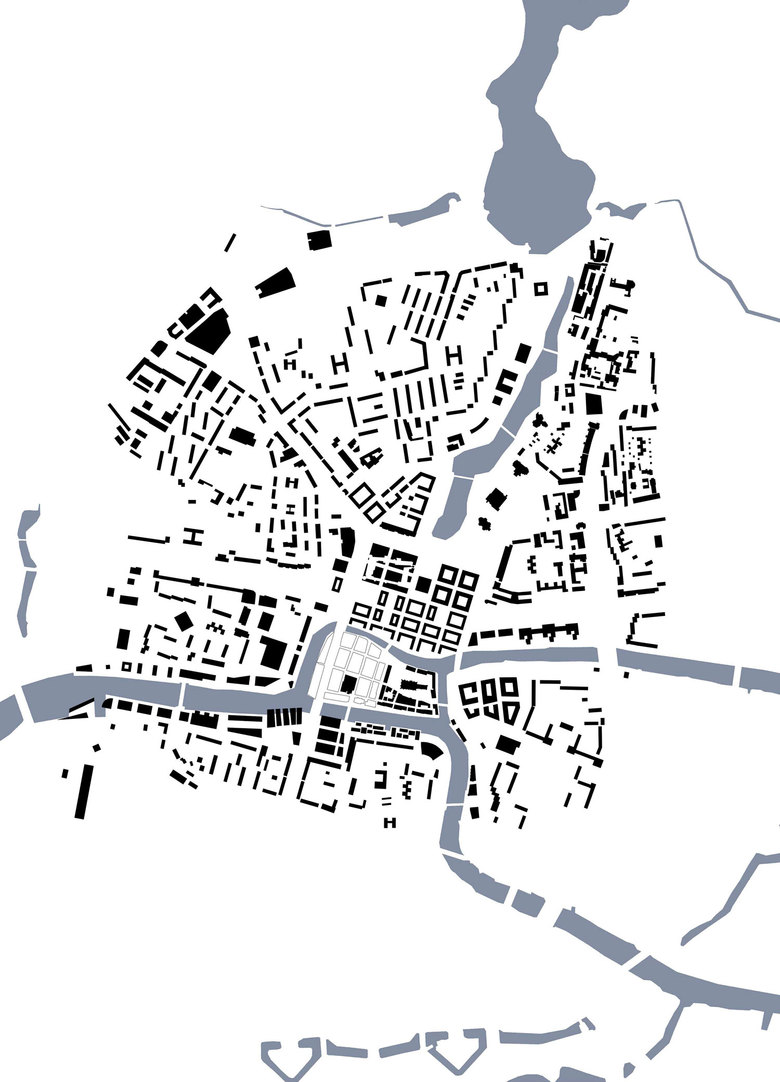 INFRASTRUCTURE – Moscow and Lenin Prospekt are prim elements of development in the new concept, too. The main difference to today's traffic solution consists in the removal of the Moscow Prospekt in the area of today's park in the southern part of „Altstadt“. The newly emerging roads are based on the historical course and are linked on three sides by a kind of a clasp to the primary network. So the whole area is connected to this system by the north-south-axes like a harp. The crossing pedestrian connections are basically passable for special vehicles of the fire brigade, the medical care and the waste disposal. An advantage of this urban planning concept is the fact that its solution is independent of ideas about demolition or preservation ofthe bridge over the Kneipphof-Island, because the bridge is not relevant for the concept. For the sake of a well-kept townscape, urban development, and also the intended traffic reduction in the central part of the city it has to be considered to remove the bridge perspectively. Therefore it will be possible to realize a building development at Kneipphof, for example according to the idea of a critical reconstruction with several historic buildings, such as the town hall, the high school and the university or with a partial development of residential buildings. With the exception of short-term parking street parking should be prohibited throughout the hole inner-city district. Parking is generally provided below ground level.