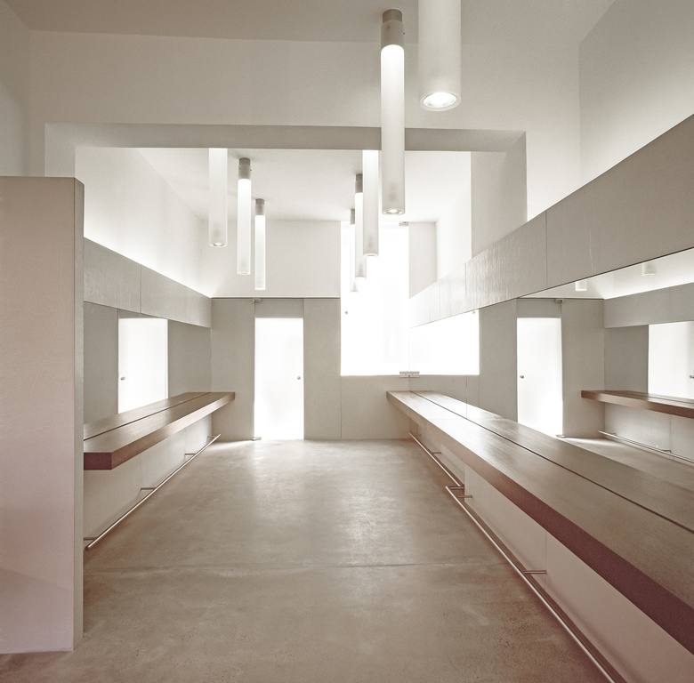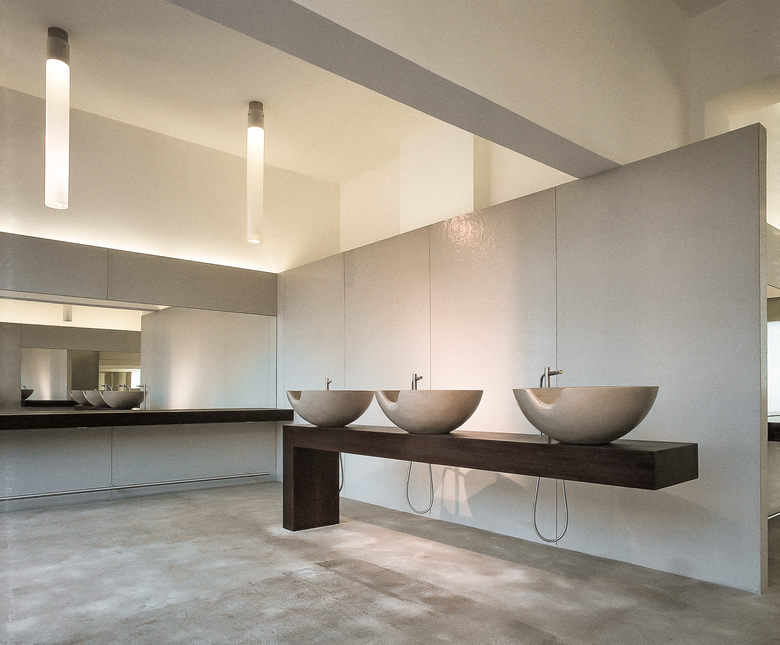 Neuer Auftritt für eine stadtbekannte Institution. Die Reduktion auf Unverzichtbares und Präzision im Detail entsprechen der formalen Sprache des Bauherrn. Beton an Böden und Wänden, kombiniert mit schlichten Einbauten aus Wengenholz. Exklusives Produktdesign der Architekten für Becken und Leuchten unterstreichen Individualität und den hohen gestalterischen Anspruch des Kunden.