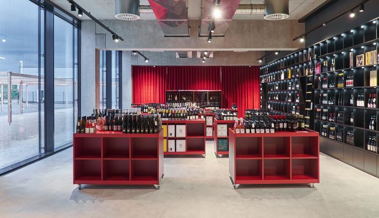 Kombination einer hochfunktionalen und wirtschaftlich geplanten Logistikhalle mit einem für das Publikum geöffneten Veranstaltungs- und Verwaltungsbereich im Kopfbau. Das Herzstück des Corporate Interior Designs bildet der Kundenempfang mit Verkaufsbereich im Erdgeschoss, an den eine Showküche mit Eventfläche angeschlossen ist. Unter dem Leitmotiv Bühne für den Wein wird der Industriebau mit individuell entworfenen, hochwertigen Einbauten kontrastiert.
