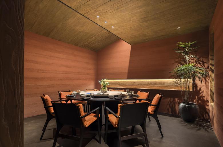 包间材料上采用混凝土地面与红土墙面,采用红色的夯土是回归砖的本源,在材料上通过解构--重组--再解构的手法为“半山腰”上海西岸梦中心店的故事结尾,同时木制的吊顶和灯光的搭配也营造聚餐的松弛感。