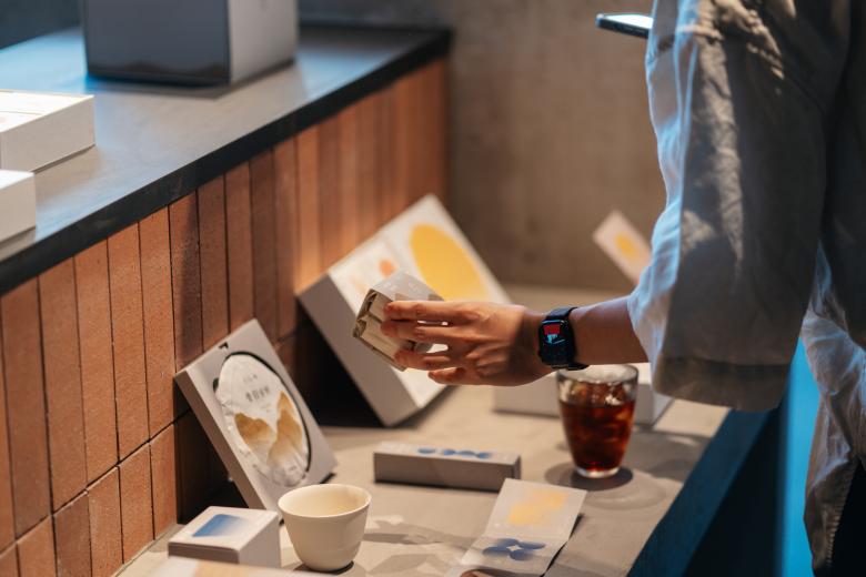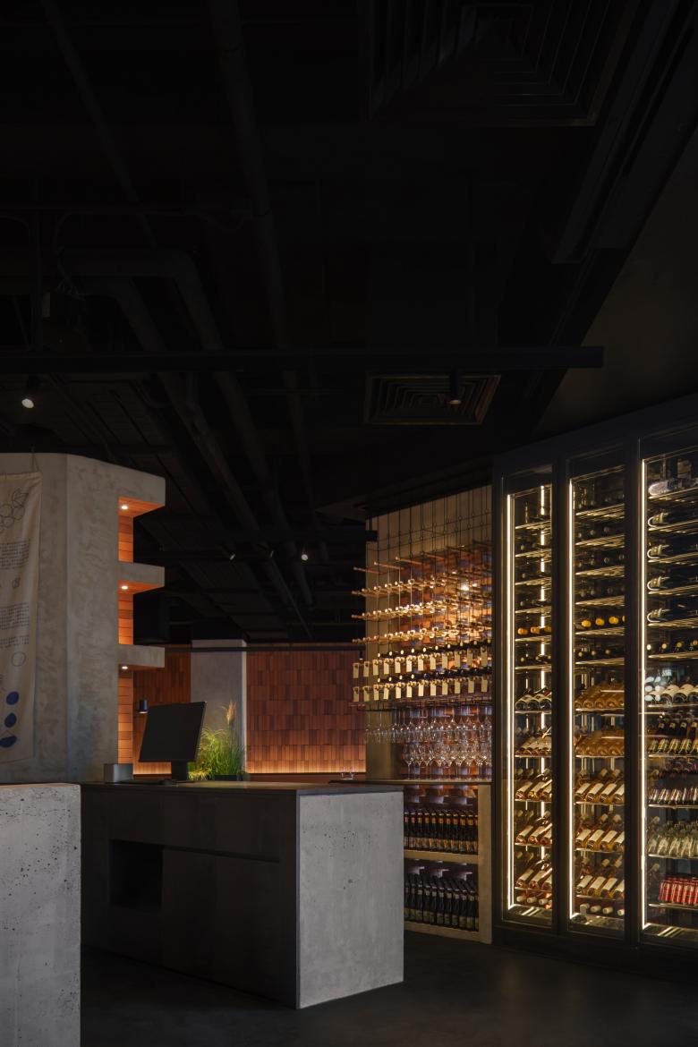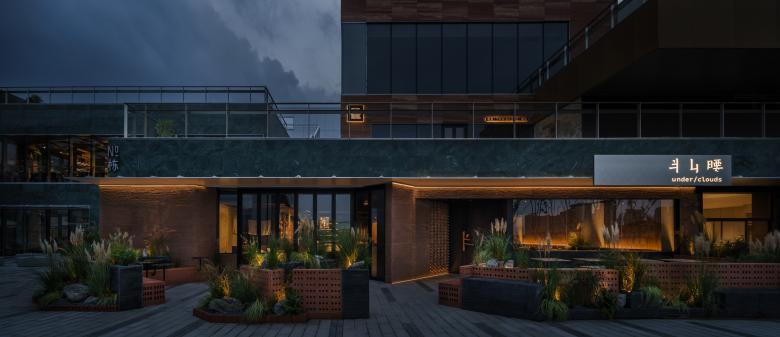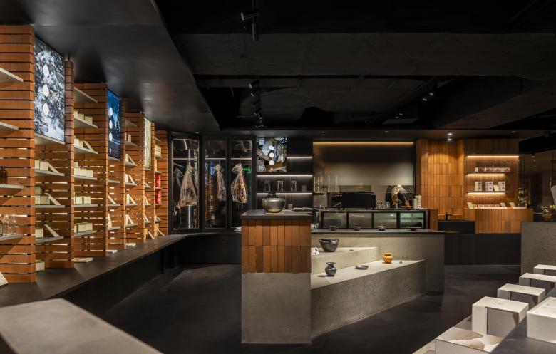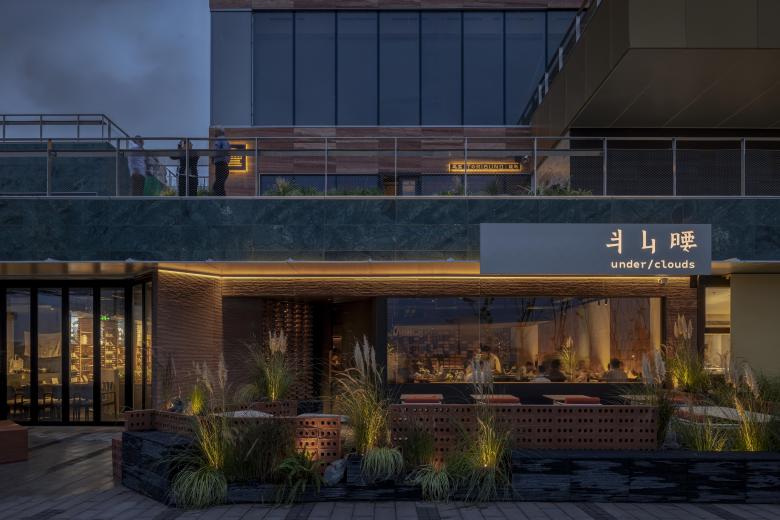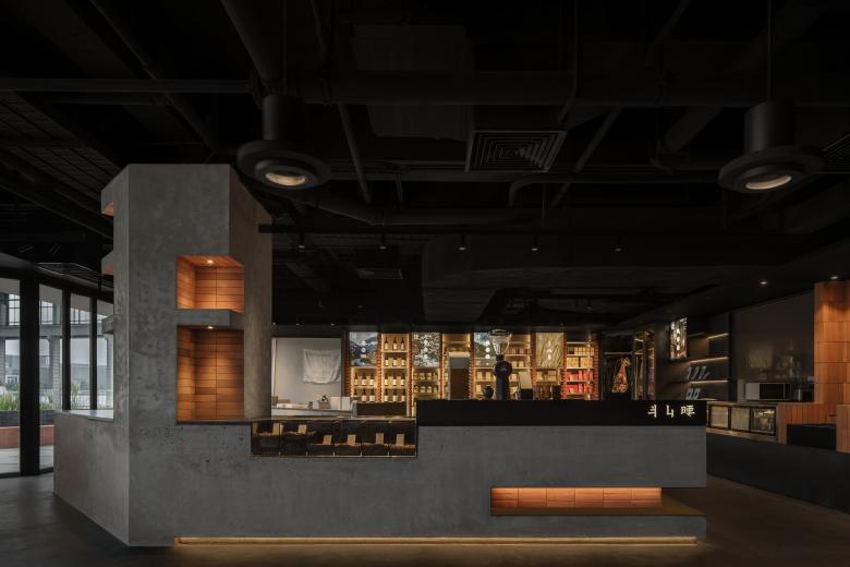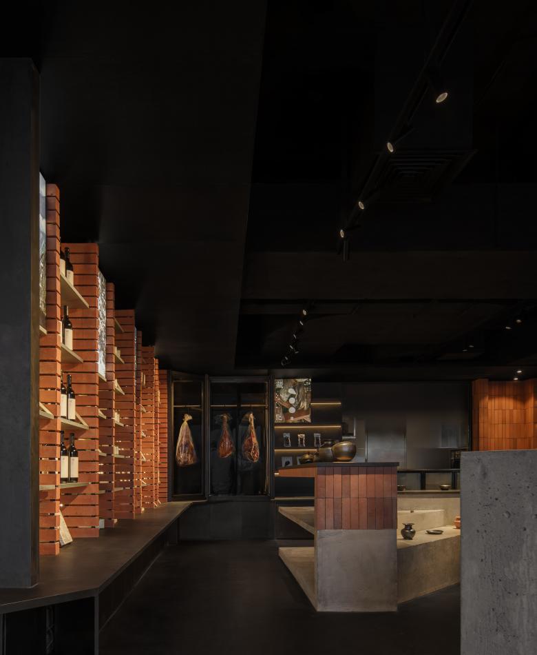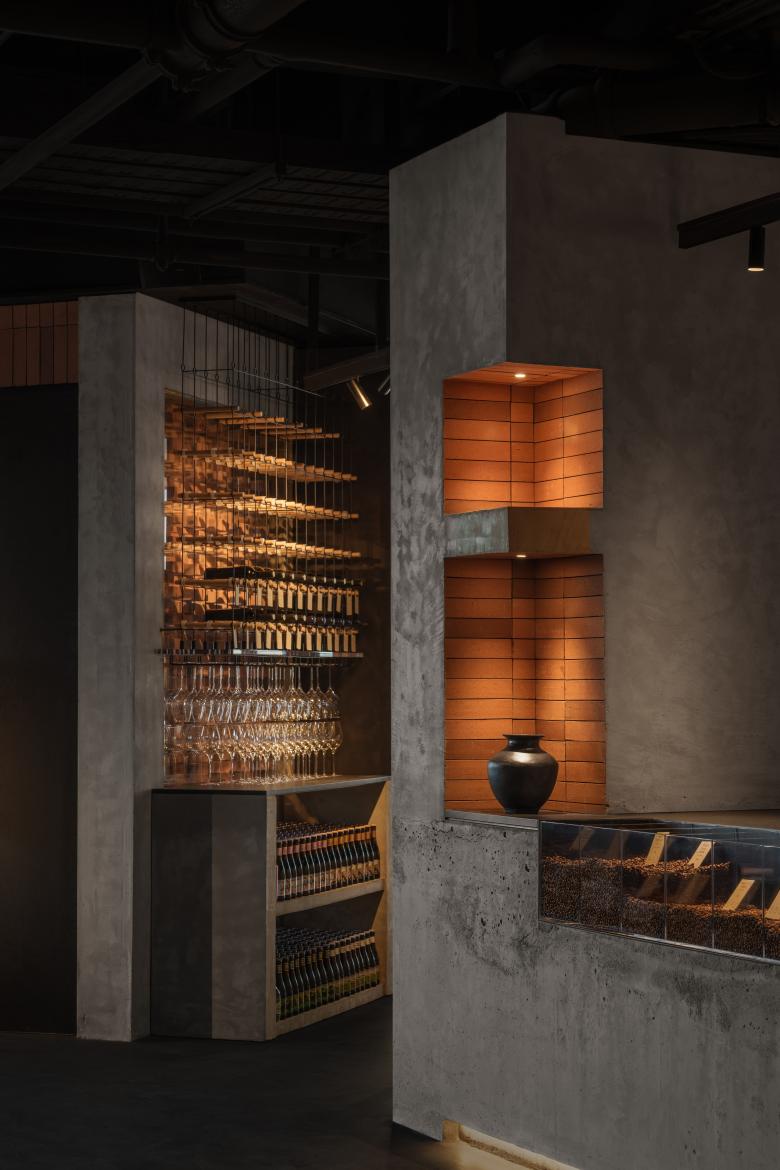 风物区材料上采用混凝土多,红砖少,结合耐候钢的金属感,增添零售的精致感。作为Under Clouds餐饮品牌第一家引入风物零售+餐饮的店,设计之初我们就考虑在轴线上和原有码头船坞联系,在空间地域和时间上对话,因而风物零售空间与就餐区中间的空间流线旋转了45°。而风物区作为一个带有展销属性的空间,将吧台作为开放式的岛台,可以让每一个顾客以参与制作食物的方式进入餐厅,同时在这个过程当中去了解品牌,了解云南,丰富了就餐形式,也将温度赋予了空间。