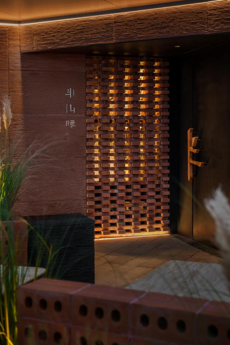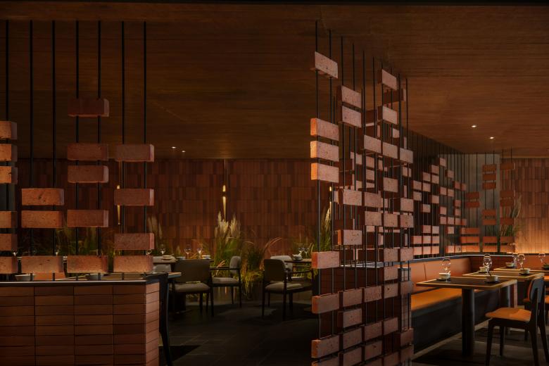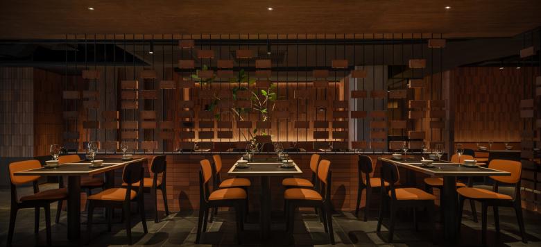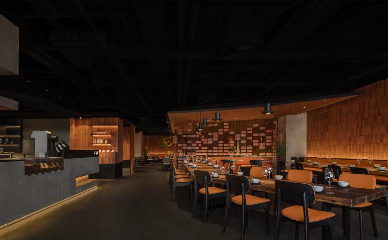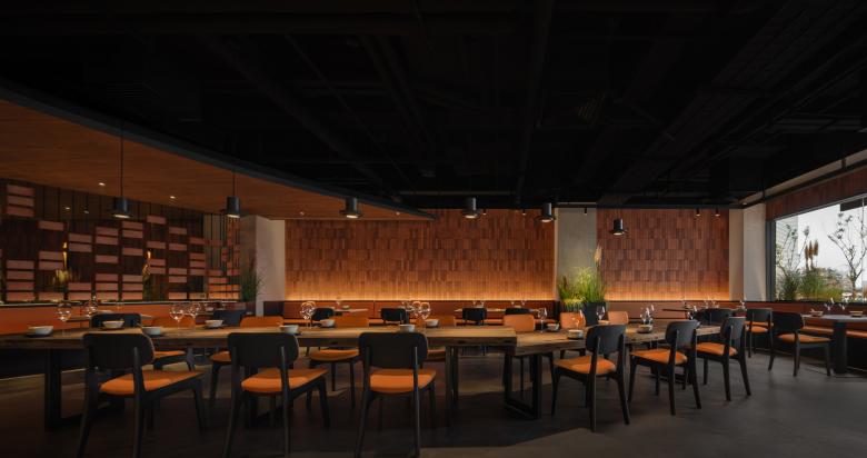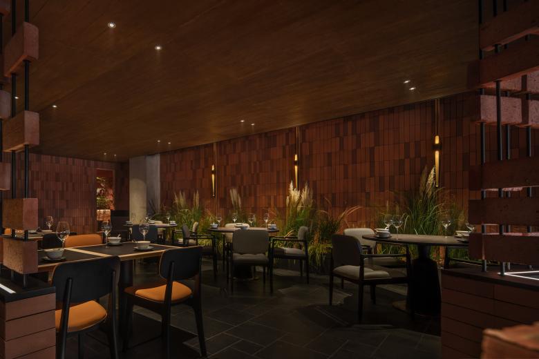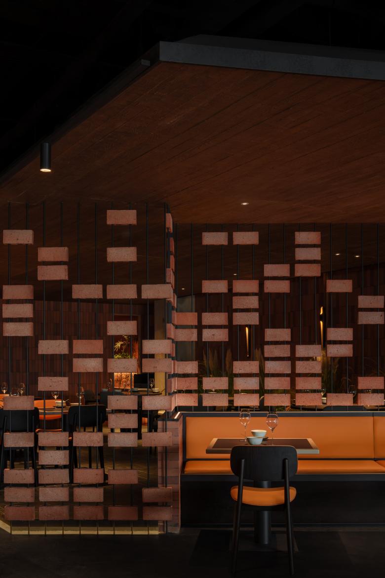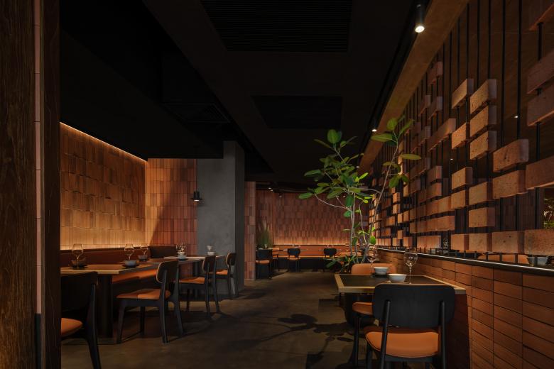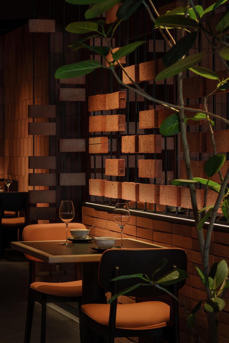 开放餐区过渡到半私密餐区,采用钢丝吊挂红砖进行隔断,错落有致的悬挂红砖仿佛跃动的音符,为就餐空间注入了灵动与趣味,赋予整个环境一种轻盈而富有韵律的氛围,通过局部的抬高也创造了不一样的就餐空间,让用餐的客人产生视觉联动。吊顶采用GRC木纹混凝土,打造一个用现代语言来设计的“原始木屋“,沿墙布置景观绿植,通过材料和食材的气味把用餐的人带入云南的乡土气息之中。