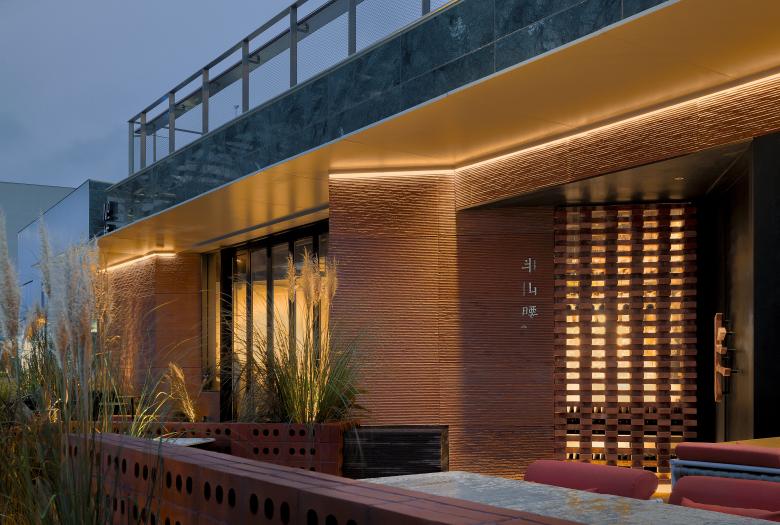 户外空间材料上采用混凝土砖、红砖、石头,景观的加入凸显出了自然的野性生长,给予户外的粗野感。立面上,半山腰餐厅用“红色混凝土板”替换掉原有的落地窗和墨绿色石材,让整个餐厅在街区里显得别具一格,富有生机。触摸墙面能感受到天然材料的力量感,当上午的阳光照射墙面,凹凸的材质感被光影强化,呈现出不同的层次,同时在不同的时间段,阳光让不同的景观倒影呈现在墙面上,在半山腰餐厅的立面上进行着光影创作。