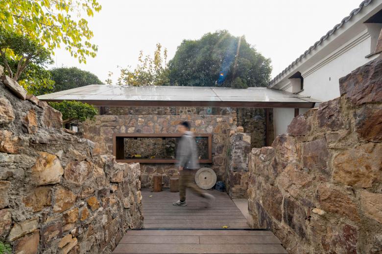 小院入口对保留的建筑墙体进行保护与展示,六间五柱,大木构架为抬梁穿斗混合式,具有江南民居建筑的典型特点。