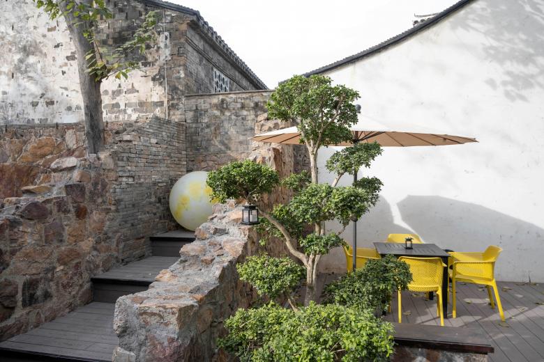 我们在保留后院遗存的黄石墙垣的基础上,增加了平台、阶梯、座椅等元素,以满足酒馆业态的使用需求。新业态的植入使这片废墟重获新生,让遗迹不再是仅供观看的展品。