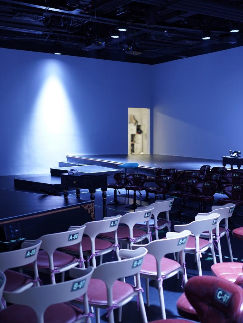 除了剧场与酒吧的属性,唯因万境还包囊了轻餐及剧社工作室的功能。剧场、酒吧、工作室,在空间与时间的组织上镶嵌交错,按人群的动态特征,将学习、体验、表演、观影、餐饮、小酌等功能,由主界面向内依次排布,同时利用流动的通道将三个板块沟通串联,使得不同动机的角色在空间中得以灵活地穿行,角色之间的对话互动也更加有机自然。