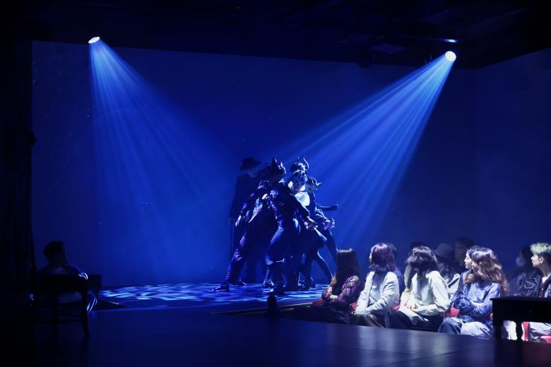 流淌的曲线贯穿整个空间,给人以飘渺虚幻的暗示,同时也模糊着空间的边界,最终打破戏剧的“第四面墙”: 异形舞台与观众席交织,共处于同一场域;沉浸式投影幕在四周延伸,无限扩大了边界。观众不再是被动地观看表演,而是在空间与剧情的编排下嵌入到了故事之中,与演员们共同编织完成生动的故事。