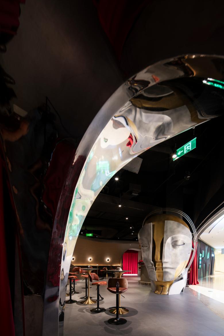 开幕前,入口幕布打开,观众可进入酒吧享受闲暇时光的一杯小酌,演员则在剧社进行创作、排练,剧场内则进行着设备调试与场地布置。随着暗示“即将开演”的幕布落下,以装置艺术为引导,观众开始通过拱形隧道进入主空间,穿行在细长的前场通道内,昏暗的灯光,朦胧的幕布与肌理,都在一步步过渡、削减观众对外部商场的空间感知,使其从现实世界逐步剥离,沉浸于曲线与光影交织的“洞穴”中。