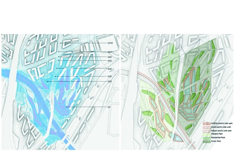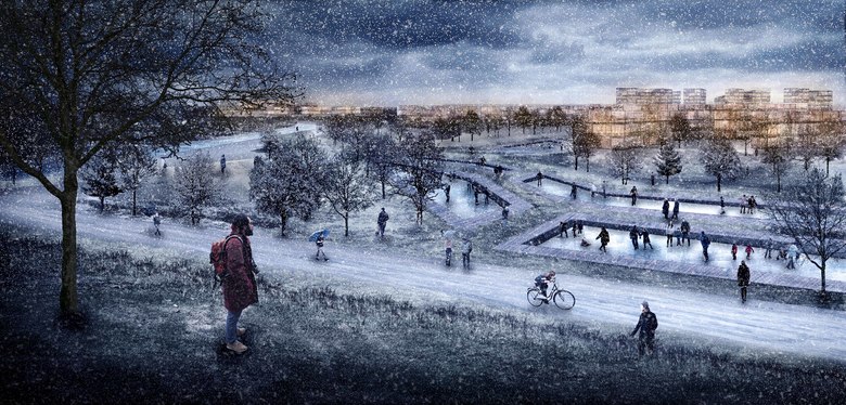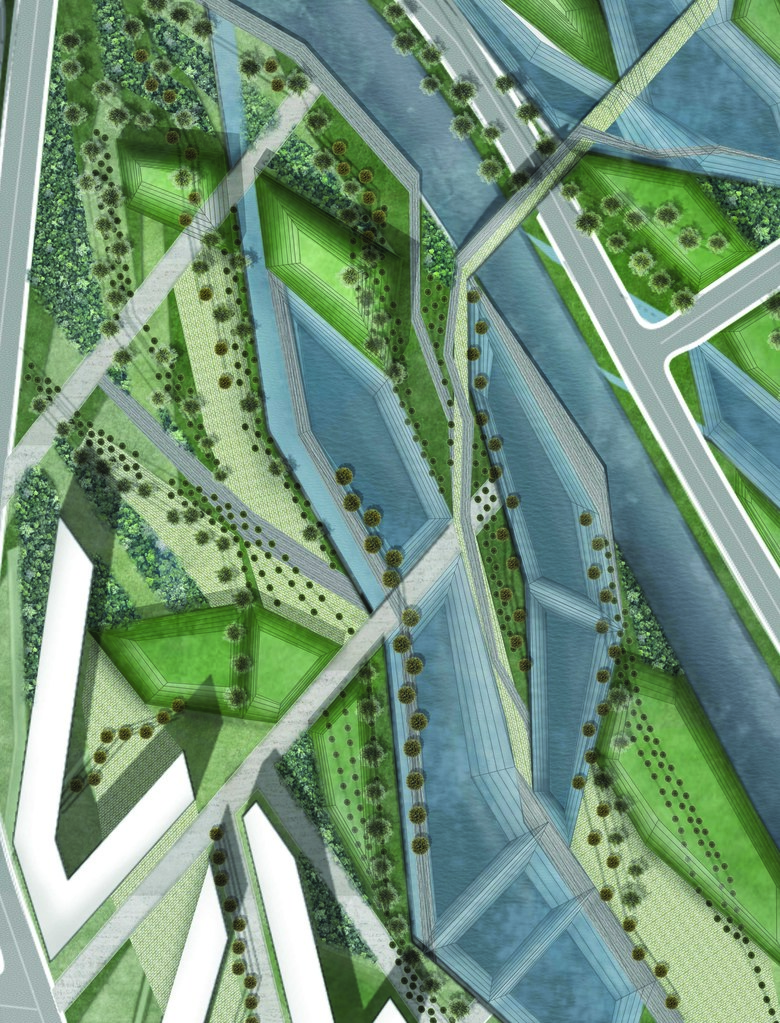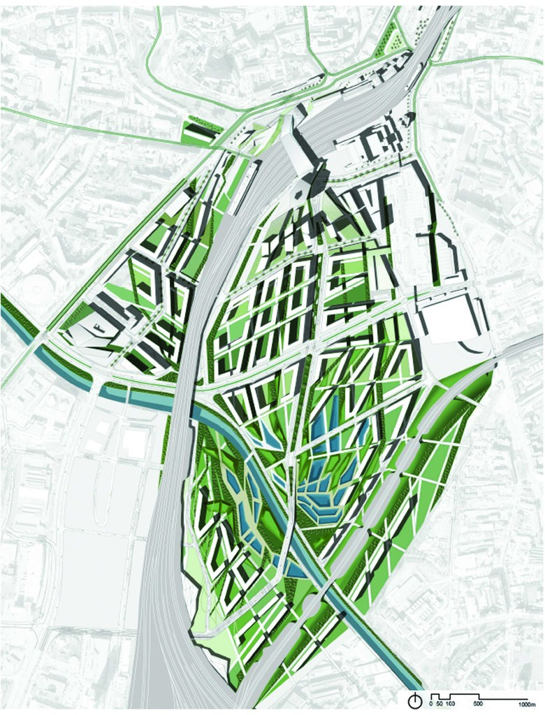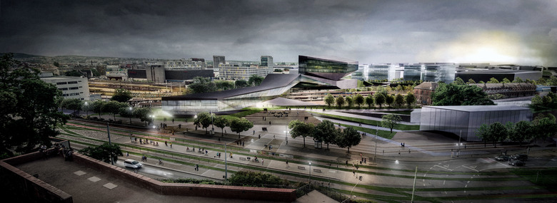 In order to foster the integration of this large and central area into the city of Brno, it was vital to combine connectivity with a vibrant mixed use program. Achieving the same density as the traditional turn of the Century neighborhoods nearby yet giving a decisively green and recreational quality that will also cater to the city as a whole resulted in the concept of pedestrian access with strategically placed array of parking garages.