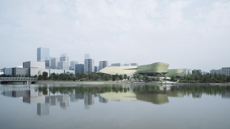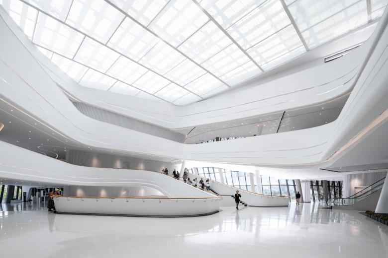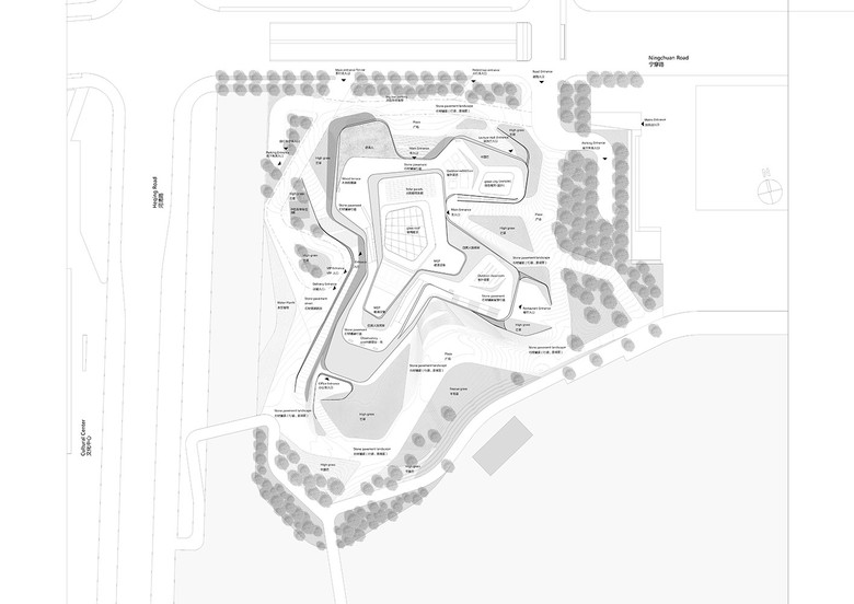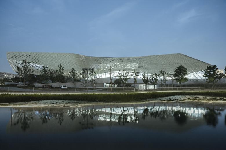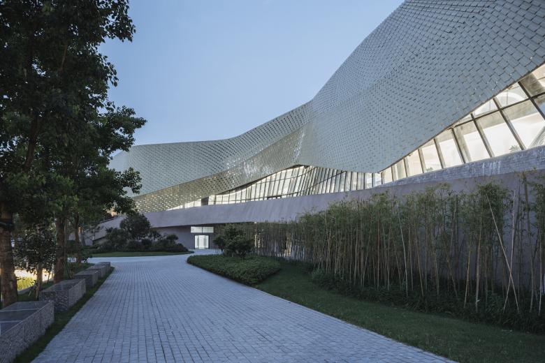 The City of Ningbo has a rich history in ceramic production. It was here that the so-called Ceramic Road began. The city played an important role in the national and international trade of ceramics throughout the civilization’s history. That said, the use of glazed ceramics is not simply an homage to the local traditions of Ningbo; the building’s textured glazed ceramics also create ephemeral reflections of surrounding landscape. These reflections animate the facade with varying intensity depending on time of day, season, and weather.