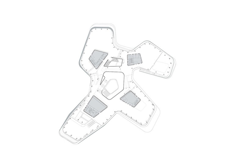The enormous volume containing 24’929 m2 floor area has been split into four main blocks connected by a central atrium. This leads to a faceted outer perimeter breaking the overall scale of the building and creating comfortable humane spaces around the volume. As an architectural antithesis of the surrounding “mega-blocks”, it brings a certain intimacy to the neighborhood. The building invites to stroll around and to explore various spaces, views and activities.