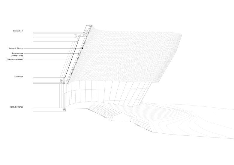 From a distance, the building skin appears like a natural extension of the surrounding landscape. With its form and reflective qualities, the façade modulates visually with its context. Up close, this modulation is also applied in the deployment of the facade system and details. It functions much like a natural filter of leaves. The ceramic screen gradually shifts between being nearly transparent to fully opaque, according to program needs and views to the surroundings; while around exhibition areas the tiles overlap tightly, they open up in gathering areas to allow ample daylight and scenic views. At night, the pattern glows from inside as shadows populate the facade’s curved apertures.