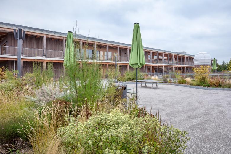 In die Brüstungen der obergeschossigen Laubengänge vor den Klassenräumen sind Bepflanzungskästen integriert, die von den Schülerinnen und Schülern gepflegt werden und sich ebenfalls positiv auf das Mikroklima und die Atmosphäre der Räume auswirken. Sämtliche Glasflächen erhielten zusätzlich zu den Dachüberständen einen außenliegenden Sonnenschutz aus Aluminium-Horizontallamellen, die gleichzeitig Lichtlenkfunktion übernehmen.