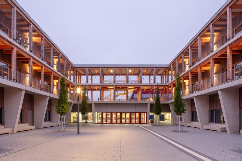 Der Rohbau wurde in Holz-Beton-Hybridbauweise erstellt. Erschließungskerne, Stützen und Gründung sind in Ortbeton konstruiert, sämtliche Decken in Holz-Beton-Verbundbauweise. In den Klassen- und Fachraumbereichen kamen Fertigteile aus Brettstapelplatten und Aufbeton (so genannte Elementdecken) zur Anwendung. In den Großräumen (Sporthallen, Mensa und Aula) wurden ebenfalls Holz-Beton-Elementdecken auf Holzbalkenlagen verbaut.
