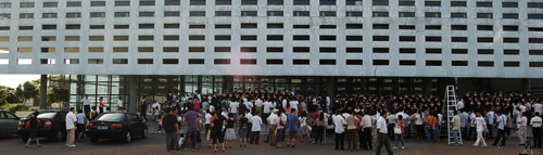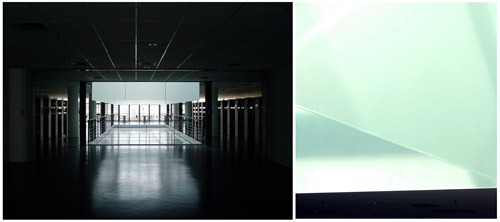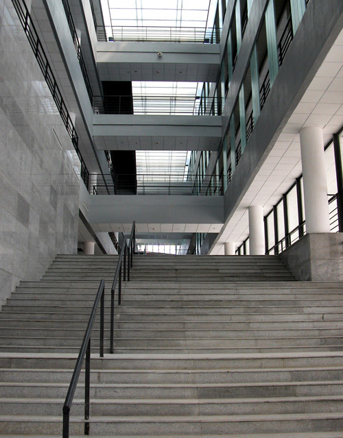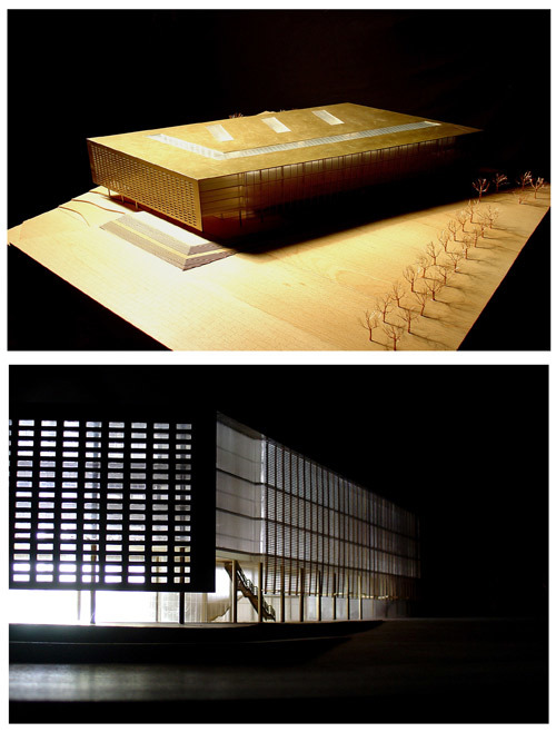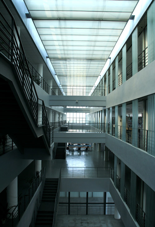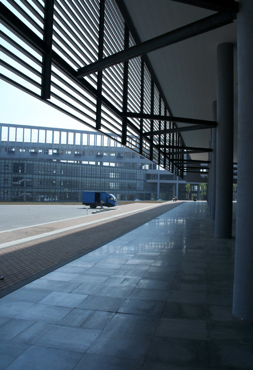 to the west and the plaza to the east. Taking advantage of the site condition, the grand steps add monumentality for the east and south fronts. The internal streets allow sunlight to reach the center of the building. It also form visual corridors, bringing natural views into the depth of the building. The south and north facades feature plain concrete wall punctuated by small windows. The east and west facades are made of an inner layer of sliding windows and an outer layer of aluminum shutters which provide shading, prevent glare, and give the building a fresh and transparent feel.