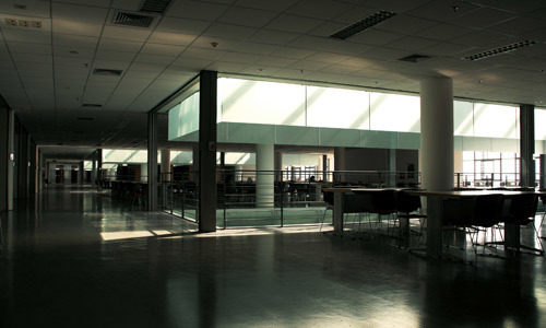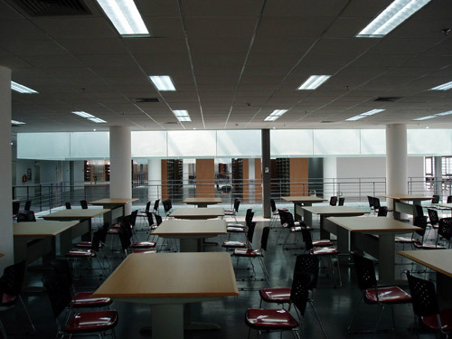 Located in middle of the campus, the library is the center of a public building complex which consists of an administration block to the southwest, a theater and a conference building to the west. It also defines a central campus plaza with neighboring buildings to the east. The succinct rhomboid shape is dictated by these site and contextual conditions. The two-level-high colonnade is to provide generous space for dynamic interactions and social life in campus. Transparency is achieved through the use of architectural glass, thus linking the natural forest