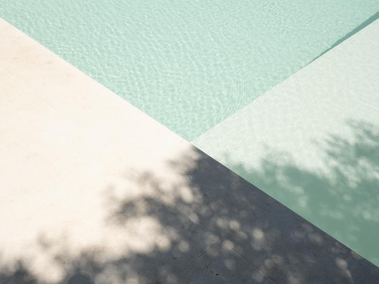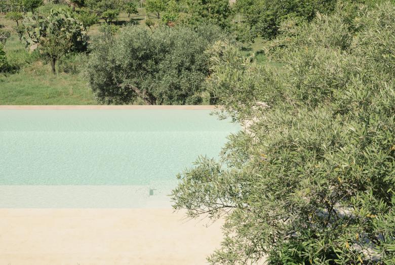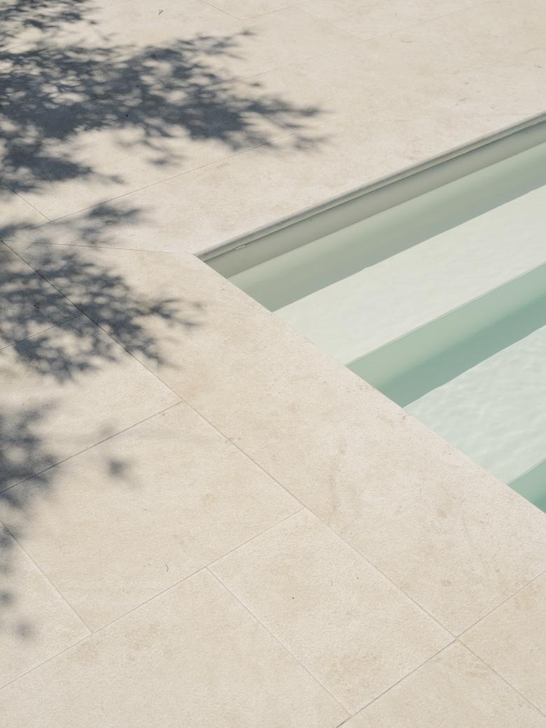 Si è scelto di utilizzare materiali naturali, la pavimentazione intorno la piscina è in pietra Thala mentre, il basamento in calcestruzzo su cui si colloca la piscina è rivestito interamente in pietra locale disposta a secco e tranciata a mano.