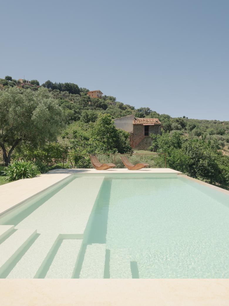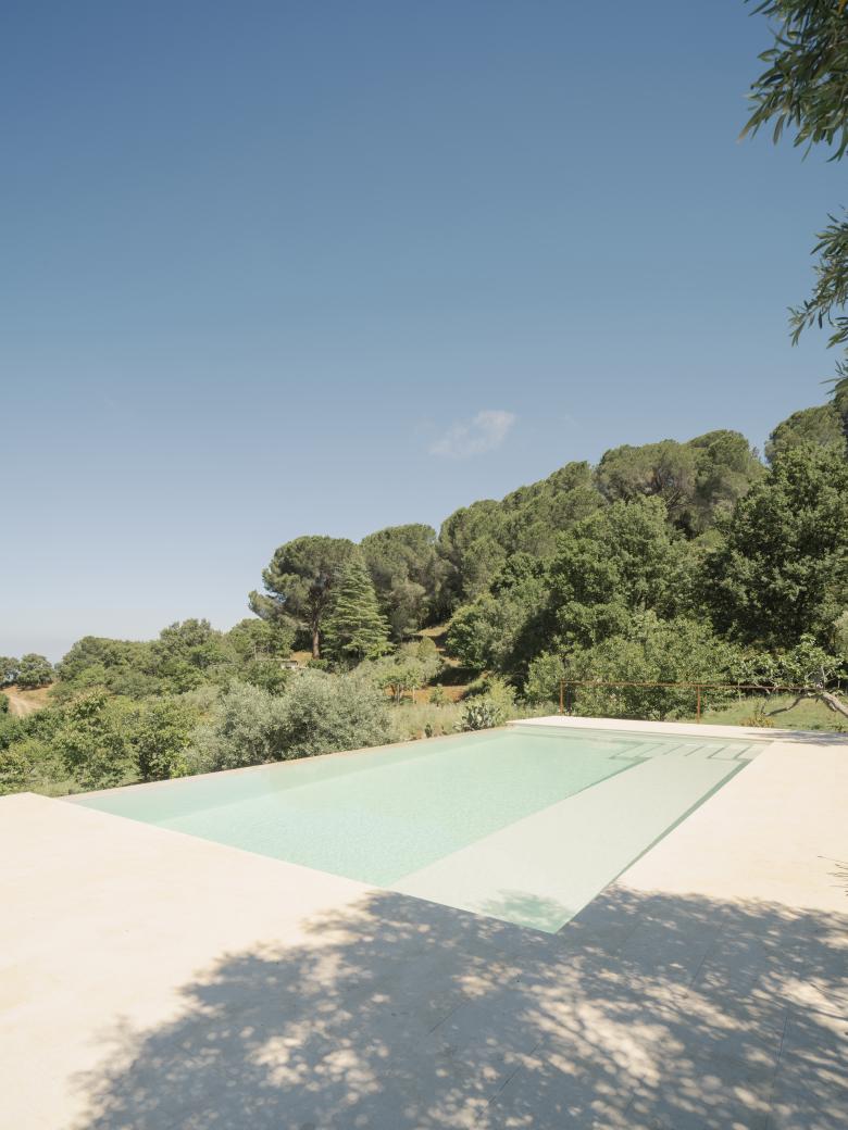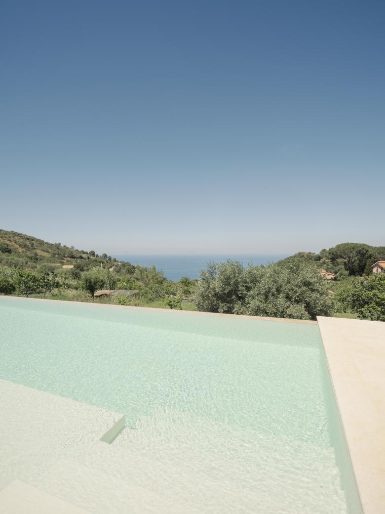 La morfologia del terreno ha condizionato le scelte progettuali a partire dal posizionamento e nella scelta di lavorare in sezione attraverso la creazione di un basamento su cui si inserisce il disegno della piscina.