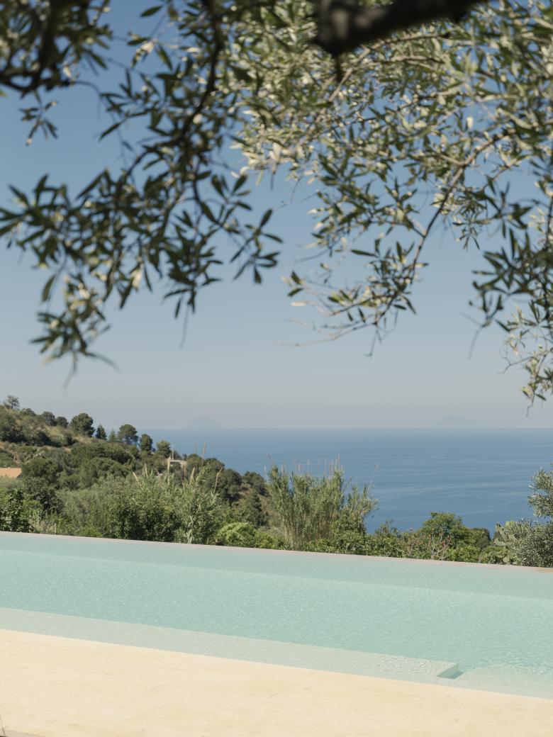 Il nuovo corpo si incassa nel terreno scosceso, creando un piano in quota con il fabbricato esistente ritagliando la vista sul mare e sulle vicine Isole Eolie.