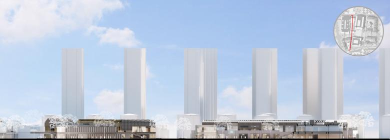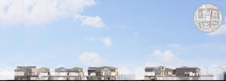 3 additional villages were constructed, weaving and reinforcing the urban fabric. The design draws inspiration from old factories and divides the large volume into an organic composition of smaller “factory-like” structures. It avoids a singular and monotonous sloped roof, instead employing a method of offsetting to create variations in height. This approach preserves the traditional architectural language while giving the facades a more modern and dynamic appearance.