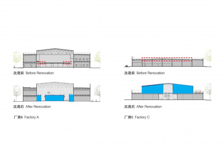 Prior to the renovation, Factory C was a single-story industrial building with a plain facade and a frame structure, significantly differing in height and roof shape from the other two factories. Kokaistudios partially removed the flat roof and added a second floor, incorporating a sloped roof while introducing large skylights to ensure ample natural light.