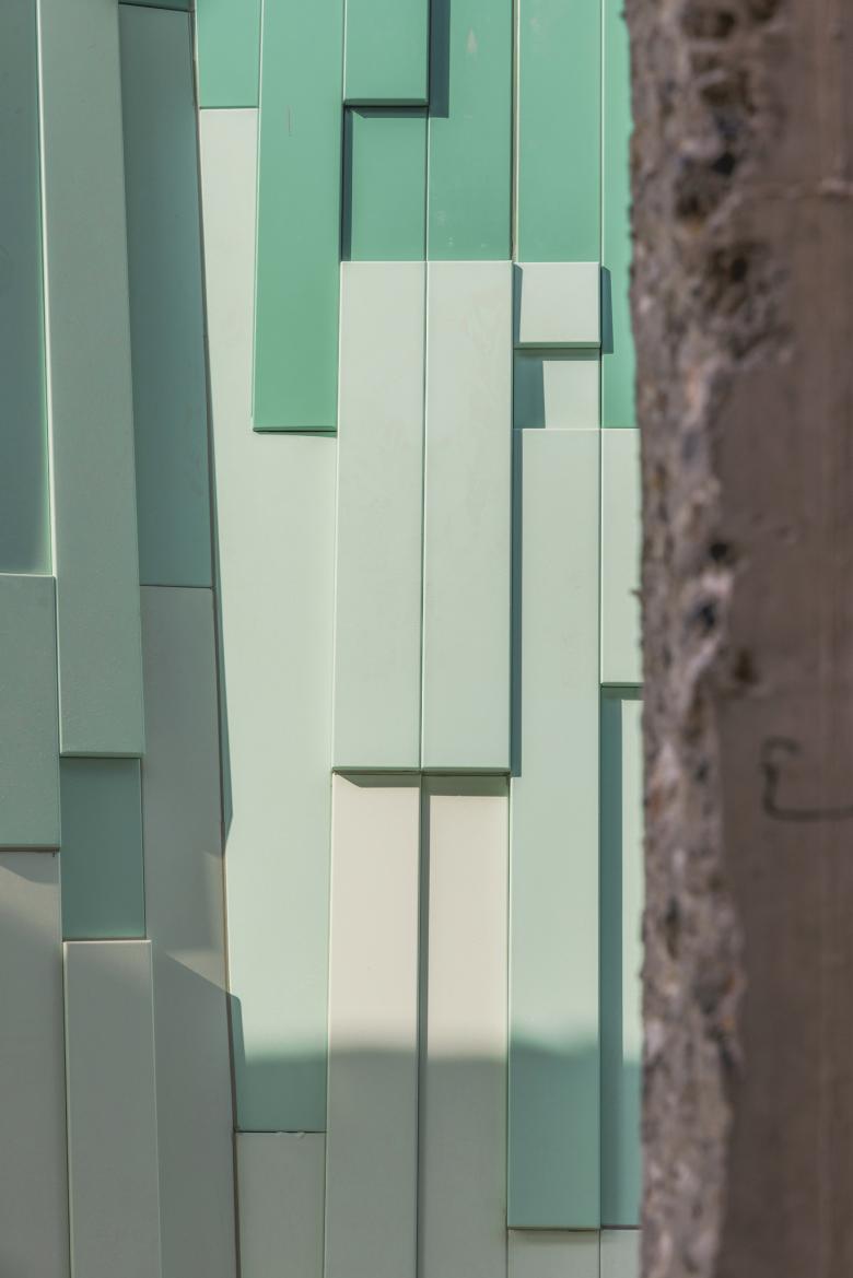 The metal curtain wall employs four variations of metal panels in both color and thickness. To unify the transitions at inner and outer corners, V-shaped panels were strategically used during construction, resolving complex junction details. Meanwhile, the roof is framed by a trapezoidal metal mesh, subtly echoing the layered contours of the mountain façade, extending its rhythm beyond the building’s edge.
