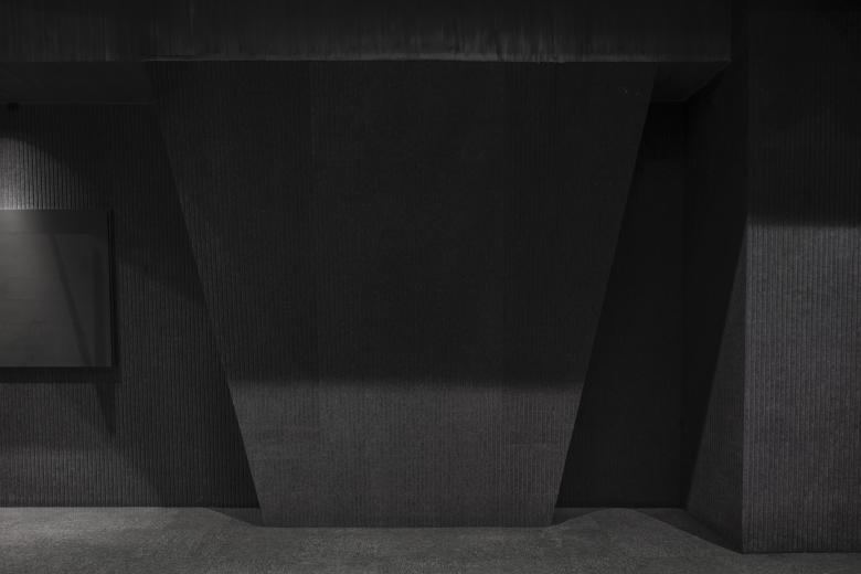 Outside, the landscape is rendered in verdant hues, evoking classical green-blue Shan Shui paintings, while the interior transforms into monochrome landscapes, embodying serene simplicity. Inspired by the "cún" (皴) brushstrokes of Chinese ink painting, the design incorporates acoustic panels and artistic coatings to create rich vertical textures. A mezzanine level echoes the inclined walls of the ground floor, immersing visitors in an experience reminiscent of venturing deep into the mountains.