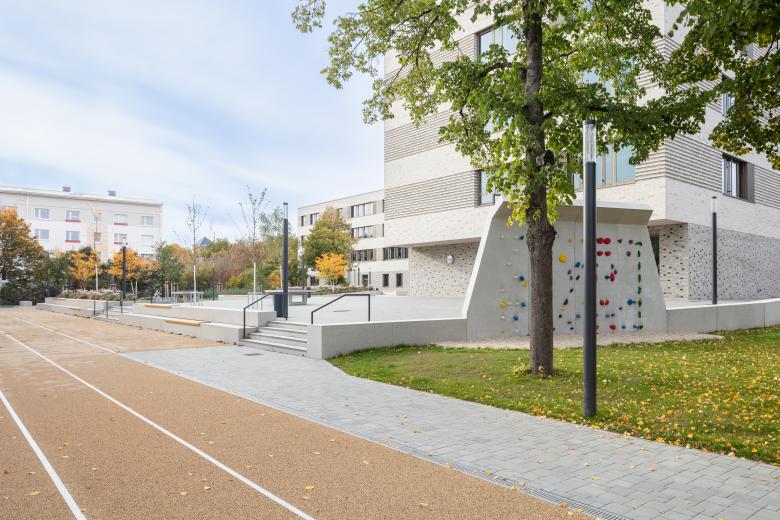 Südlich des neuen Schulhauses öffnet sich die Pausenhof- und Freifläche mit unterschiedlichen Aufenthaltsbereichen und Besonnungssituationen. Durch eine leichte Modellierung des Geländes an den Grundstücksrändern und eine artenreiche Bepflanzung in den mittleren Pflanzinseln mit Splittbelag, werden grüne Puffer innerhalb des Pausenhofbereiches und auch zu den angrenzenden Wohngebäuden entwickelt. Bänke und Sitzstufen mit Sitzauflagen laden zum Treffen und Verweilen ein. Die linearen Bänke, die die Radiusform der Gebäudeecken aufgreifen, begleiten undumfassen die Pflanzflächen. Der wertvolle Baumbestand kann in Teilen erhalten werden. Neue Bäume werden im Bereich des Pausenhofes, und begleitend zu den Stellplätzen gepflanzt.
