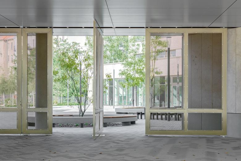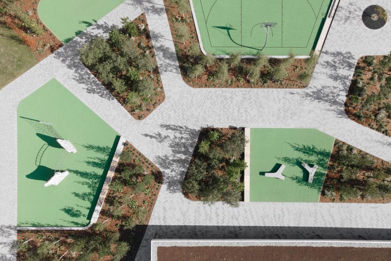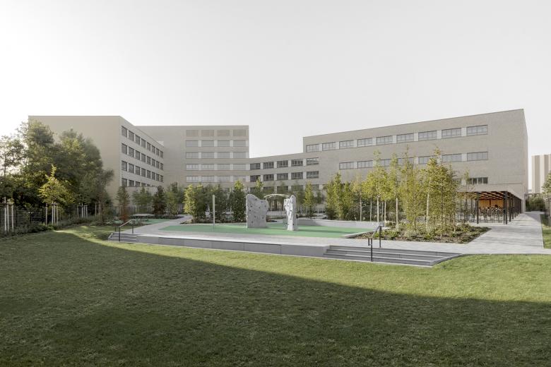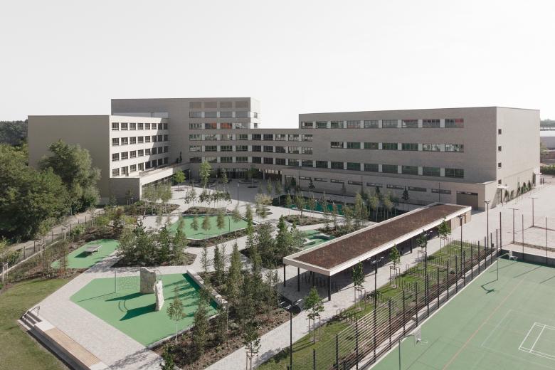 Die Freiflächen werden in die drei Bereiche gegliedert: Schulfreiflächen, Sportanlagen und öffentliches "Grün". Durch die gestalterische Setzung von "Grünen Kabinetten" als wiederkehrendes Motiv wird das Planungsgebiet zu einer eigenständigen und für das Quartier identitätsstiftenden Einheit zusammengeführt.