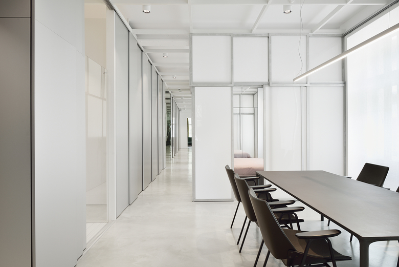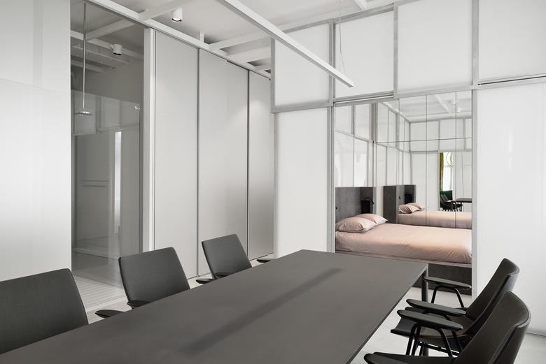 Closing the sliding doors can create neat and functionally separated spaces. Opening them, on the other hand, can offer us layers of visual experiences that vary from industrial to vintage, from etheric to earthly, from the physical space to its reflection.