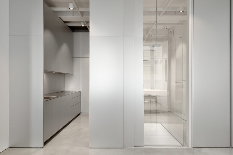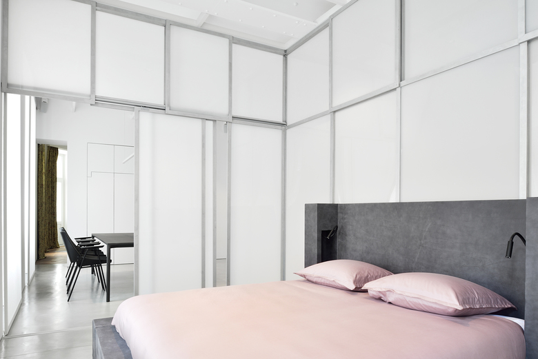 The loft, on the other hand, is defined by a grid of aluminium beams, suspended from the ceiling. The grid structures the space – kitchen, bedroom, bathroom and wardrobe volumes are defined by sliding doors, attached to the structural beams. By opening the doors the living space can be extended beyond the dining room into a bedroom and a shower, thus creating functionally diverse ambients that range from straight-forward to complex.