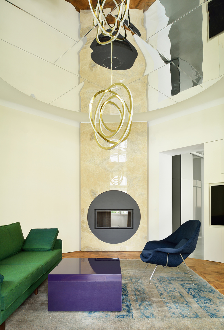 Living room, furbished in textured and warm materials, reinterprets an Art Nouveau salon. Its layered materiality – ranging from an open fireplace in onyx stone to vintage hardwood floors –is reflected in the round ceiling mirror that acts as an illusionist fresco. The room is ambientally lit: apart from the contemporary chandelier, whose light is reflected in the ceiling mirror and polished stone, the fireplace itself, with light fixtures behing the thin onyx stone, can become a source of light.