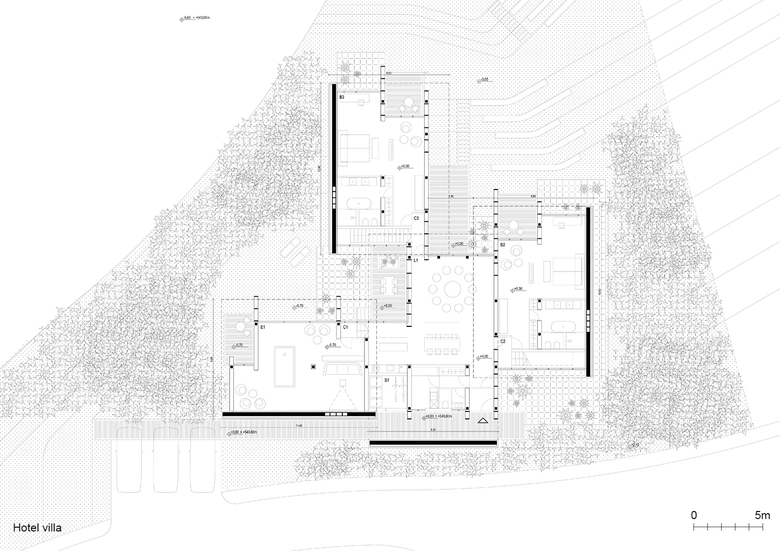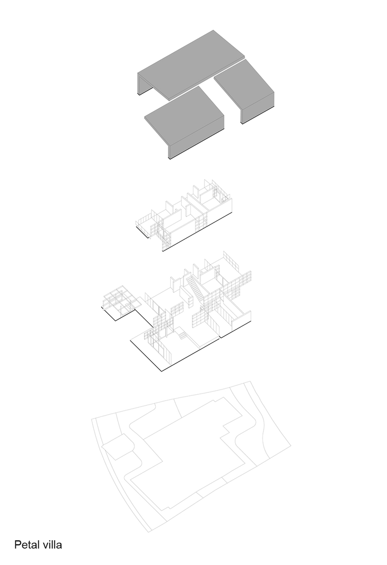 Petal Hotel Villa consists of four main petal shells that cover a central living area and private sleeping areas. Centrally positioned common living areas are surrounded by five private bedrooms. The villas are designed as clusters of petal shells, which are made of vertical concrete walls and horizontal steel structure. Petal shells are continuously covered with prefabricated concrete cladding on the outside walls and on the roof. Partition walls and facade system are mostly gridded frames with panels of various characters: completely transparent, semi-transparent or full.