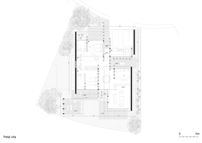 Petal Villa consists of three main petal shells. One covers an open parking area, while the other two accommodate living and private sleeping areas. Main living areas are arranged around private open terraces that are oriented to the South and West.