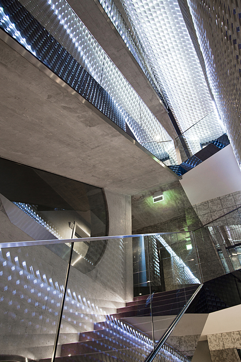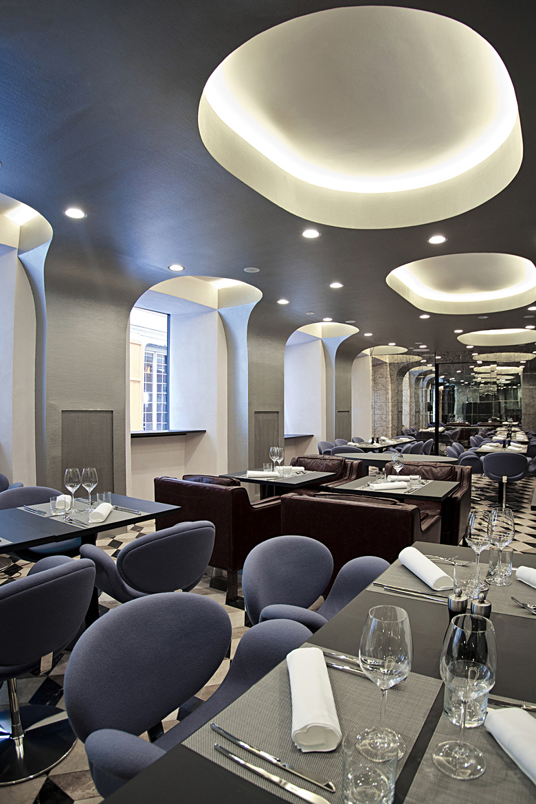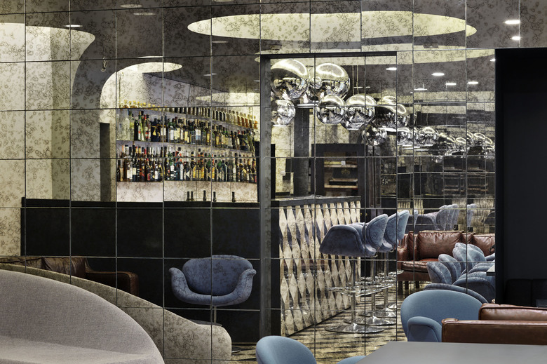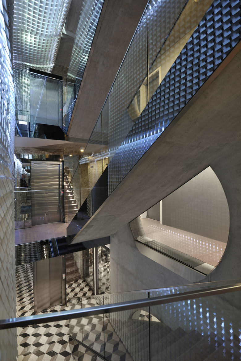 The exterior with historically preserved facade stays intact but immediately you enter the hotel you actually enter a specific space that is the space of hotel Vander. The design is based on kaleidoscopic play of 3d patterns in different materials and reflections that extend the borders of the actual space. Because of the reflections the visitor becomes part of the interior.