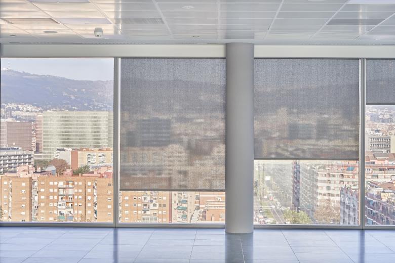 Um die Anforderungen an einen hoch wirksamen Sonnenschutz zu erfüllen, empfahl der Architekt das Gewebe Soltis Master 99 Agivir von Serge Ferrari für die Innenrollos, das eine hohe Sonnenreflexion mit einem hervorragenden Blendschutz kombiniert, der auch ein optimales Arbeiten an Bildschirmarbeitsplätzen gewährleistet. Dieses Screenmaterial zeichnet sich durch ein sehr geringes Gewicht von 290 g/m² und eine geringe Dicke von 0,32 mm aus, was für eine kompakte Unterbringung inklusive exzellentem Aufwickelverhalten sorgt. Insgesamt wurden mehr als 13.400 m² umgesetzt.