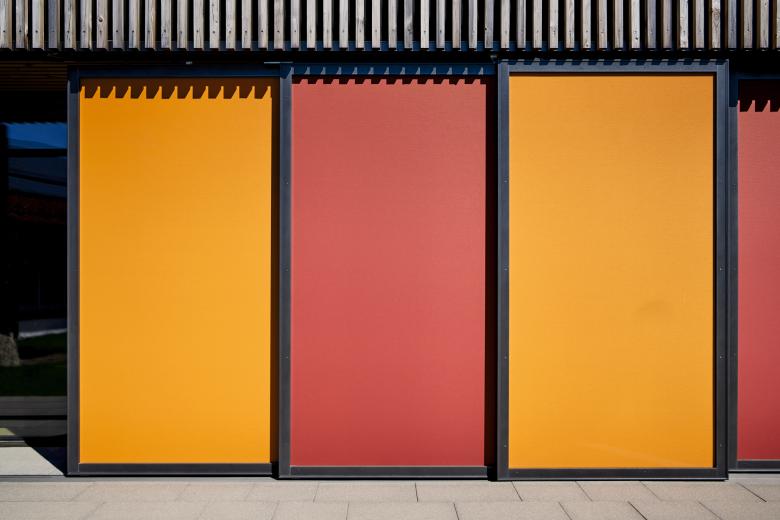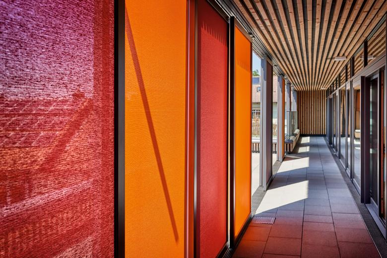 Soltis 92 ist in einer Vielzahl von Farben erhältlich, die vielfältigste Gestaltungsoptionen eröffnen und so auch den Sonnenschutz zu einem akzentuierten und kreativen Element der Fassade machen können. In diesem Fall wählten die Architekten eine Palette warmer Töne, die sehr farbenfroh sind, gleichzeitig aber auch Behaglichkeit und Geborgenheit ausstrahlen und die natürlichen Materialien der Gebäudehülle subtil ergänzen. Das Ergebnis unterstreicht das freundliche, luftige Design des Konzepts und verleiht ihm eine einladende Ausstrahlung.