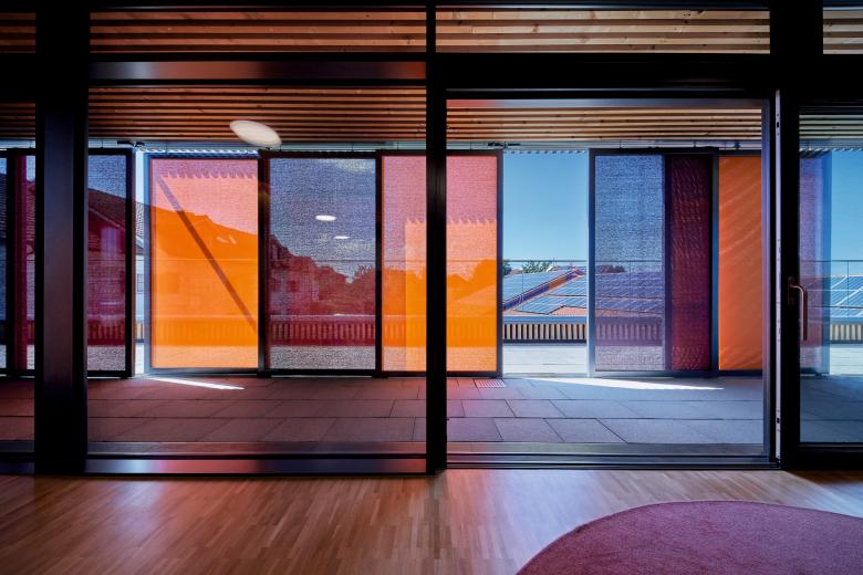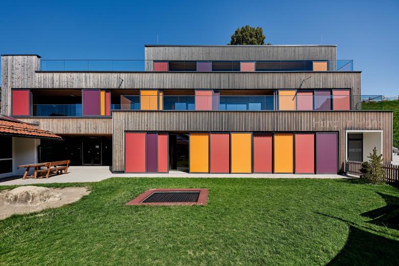 Im bayrischen Betzigau ist eine öffentliche Einrichtung beheimatet, in der eine Kinderkrippe und ein Kindergarten untergebracht sind. Zur Abdeckung des steigenden Bedarfs wurde ein Anbau realisiert, der die bestehende Einrichtung ergänzt und neuen Spielraum für die Kinder schafft. Der Erweiterungsbau erstreckt sich über drei versetzte Etagen und wurde vom lokalen Architekturbüro JAKOB Architekt Beratender Ingenieur PartGmbB entworfen. Besonders ins Auge fällt der farbenfrohe Sonnenschutz der Kita, der nicht nur gestalterisch starke Akzente setzt, sondern auch konstruktiv eine Besonderheit ist: Er besteht aus Schiebeladenflügeln, die mit Sonnenschutzscreens aus Soltis 92 der Serge Ferrari Group bespannt sind.