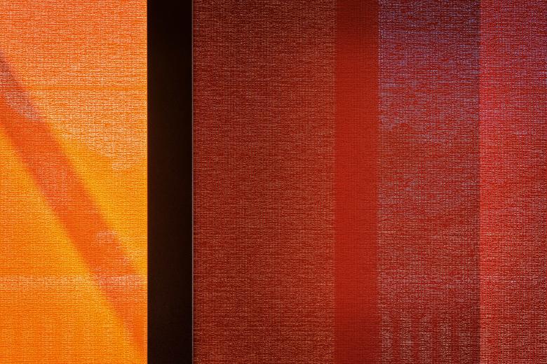 Sonnenschutzgewebe Soltis 92 in den Farben 92-50336 (Pflaume), 92-8204 (Orange) und 92-2151 (Samtrot).