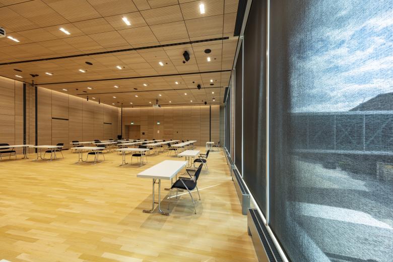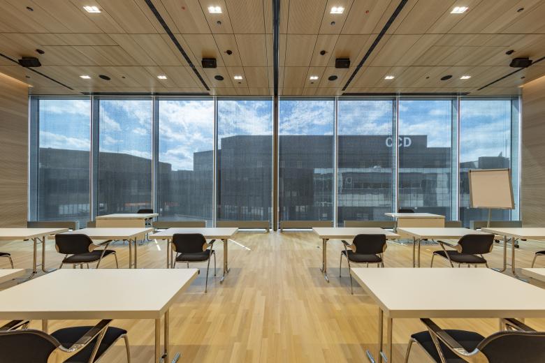 Da das Gebäude von der Typologie her einen Versammlungsraum darstellt, mussten auch erhöhte Brandschutzanforderungen berücksichtigt werden. In der Endwertung ganz oben landete schließlich das Screenmaterial Soltis SK20 von Serge Ferrari, das speziell für öffentliche Gebäude und Verwaltungsbauten mit hohem Publikumsverkehr entwickelt wurde. Mit seiner Brandschutz-klassifizierung Euroklasse A2-s1,d0 verspricht es eine sehr hohe Sicherheit im Innenbereich. Der Gesamtenergiedurchlassgrad der Verglasung mit dem Textilgewebe Soltis SK20 von 0,26 steigert den sommerlichen Wärmeschutz.