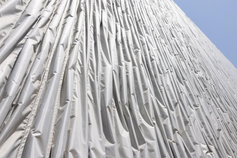 DURCHGÄNGIGER XXXL-VORHANG AUS NICHT-BRENNBARER FASSADENMEMBRAN FÜR SCHWEIZER PAVILLON