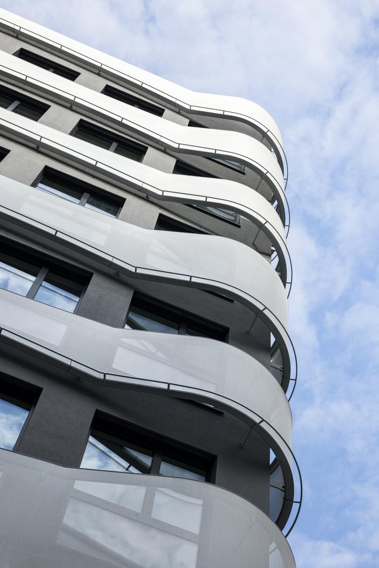 Um dem Gebäude einen markanten Ausdruck zu verleihen, sollte eine zweite Fassadenebene geschaffen werden, die mit einer dreidimensionalen Gestaltung Dynamik bringt, zum anderen eine gestalterische Klammer zwischen den Gebäudeteilen herstellt. Umsetzbar wurde dies mit einer Textilfassade, die durch ihren biegeleichten Charakter eine unvergleichliche Gestaltungsfreiheit auch für Rundungen und eine Dreidimensionalität bereithält. Im Falle des Zebra Bürogebäudes sind es wellenförmige Textilflächen mit freigeformten Amplituden. Diese bestehen aus dem langlebigen Textilnetzgewebe Frontside View 381 in Weiß, welches in bis zu 30 m langen Bahnen ohne Unterbrechung auf der Unterkonstruktion Facid 65 von Schüco verspannt ist.