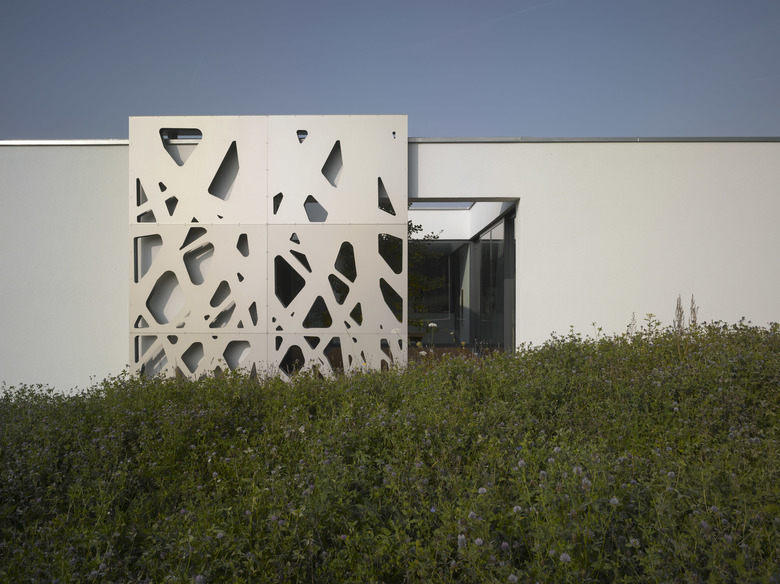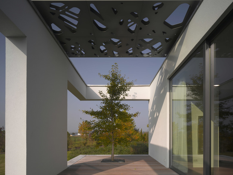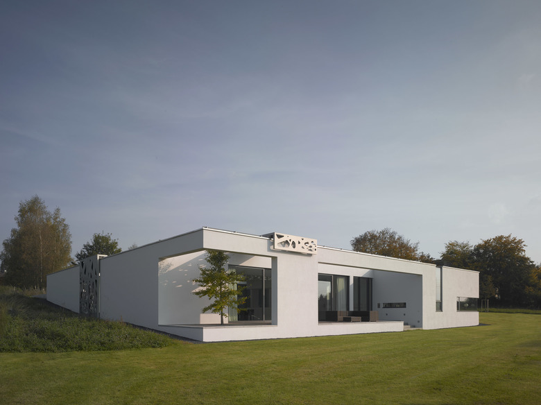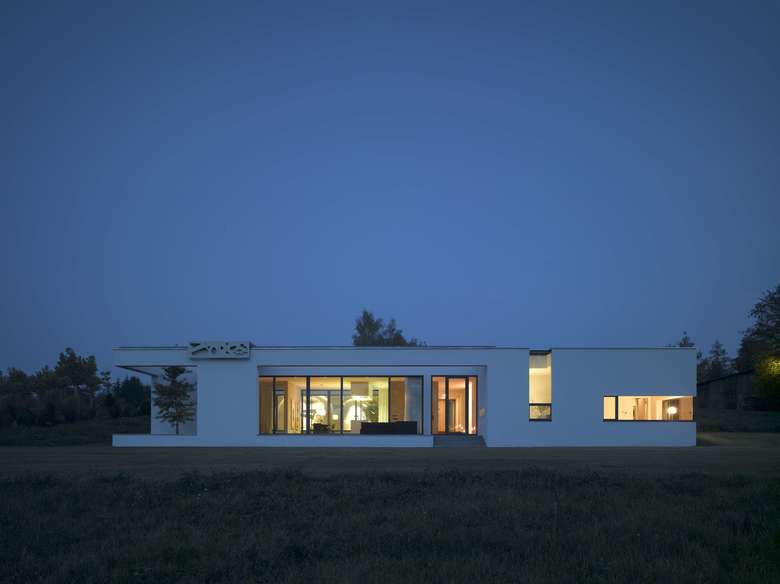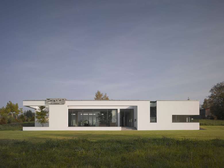 Das Grundstück bezieht seine Qualitäten aus der Topografie und seiner Weitläufigkeit, weniger aus einem "Panoramablick" wie im Wettbewerb formuliert. Darauf reagieren wir mit einem Konzept, das sowohl landschaftlichbezogene Ausblicke als auch introvertierte Höfe anbietet. Eine mehrgeschossige Bauweise verbessert nicht die Sichtbeziehung auf den einige Kilometer entfernten Lanschaftsraum. Deshalb thematisieren wir mit einem Flachdach die Topografie. Das bauliche Umfeld ist heterogen. Somit wird Haus L zu einem eigenen, aus seinem Programm generierten, ambivalenten Typus. Dieser Ansatz bietet enormes Potential für eine variable Konfigurierung. Wir bieten den Bauherrn eine Art Matrix, im Rahmen derer sie ihre individuelle Variante entwickeln können. Die Programmbereiche werden in einzelne Bauteile gegliedert, die gleich einem Baukasten zusammengefügt werden. Die Vielfalt und Möglichkeiten eines fließenden Raumkontinuums entstehen durch sich ständig ändernde Durchblicke und versetzte Ebenen.